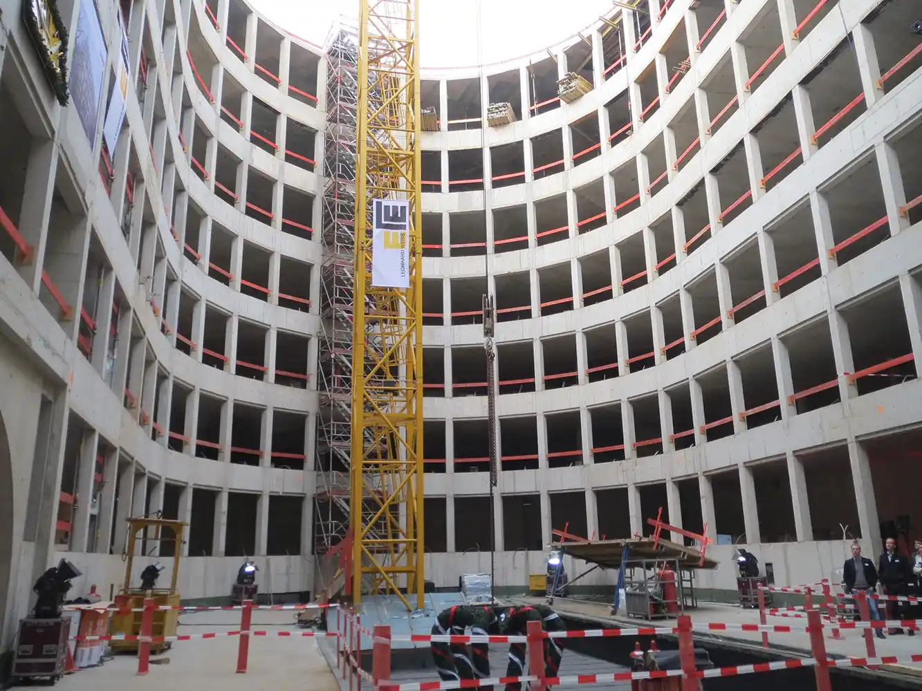 Ab dem fünften Obergeschoss werden die Staffelgeschosse durch eine Schrägstützenkonstruktion abgefangen. Die Integration von Teilen des denkmalgeschützten Altbaus, insbesondere der historischen Fassade, stellte hohe Anforderungen an Planung und Ausführung.