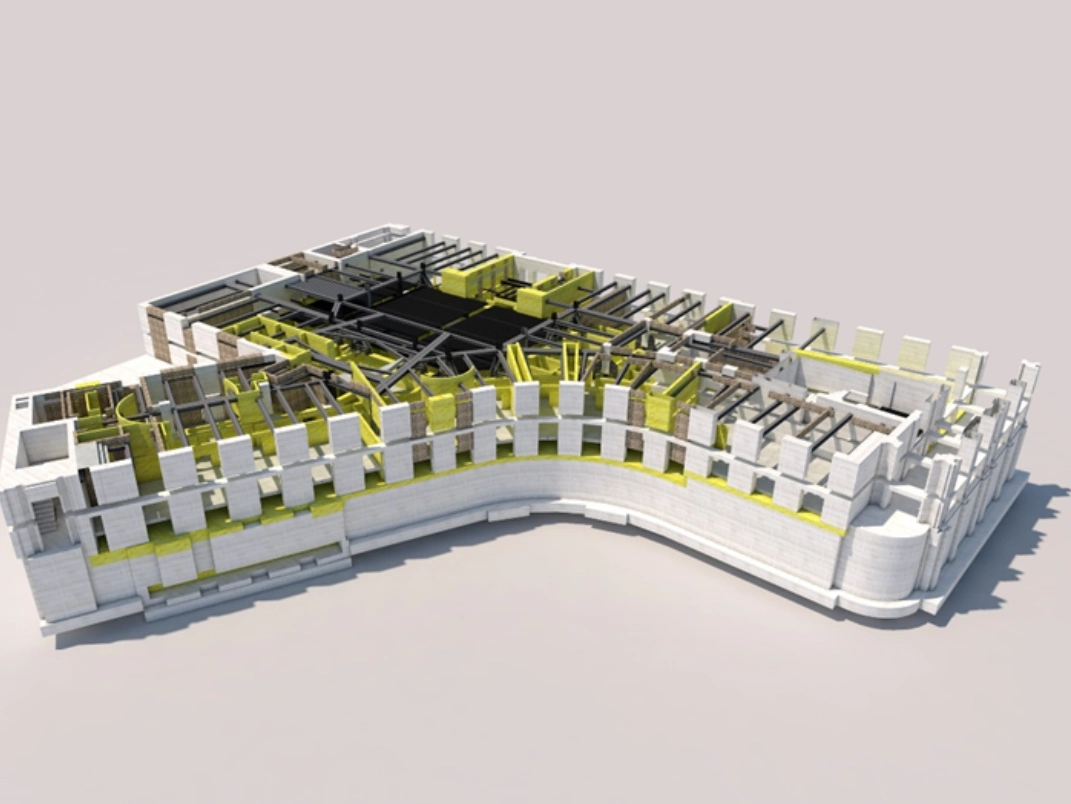 Während des Abbruchs und Neubaus der Geschossebenen mussten Stützen und Wände für den jeweiligen Bauzustand stabilisiert werden. Stahlstützen im Erdgeschoss, die Lasten aus fünf aufgehenden Geschossen abtragen, wurden für den Abbruch einer Tresorwand abgefangen und anschließend bis zur Gründung verlängert. Die neuen Decken wurden als Stahlträgerroste in Slim-Floor-Bauweise (System CoSFB) ausgeführt, die zugleich im Bauzustand zur Stabilisierung der Bestandsbauteile dienten. Die Gründung wurde durch oberhalb kraftschlüssig angeschlossene Stahlbetonbalken ertüchtigt, um größere Lasten ohne Erdarbeiten im Bestand zu verteilen. Besondere Elemente waren eine weitgespannte Schautreppe mit Einhaltung strenger Schwingungsanforderungen sowie ein freigespanntes Lichtdach in Stahlbauweise, das unter Berücksichtigung der Brandschutzanforderungen an die Bestandsebene angeschlossen wurde. Das Abbruchkonzept integrierte die Neubaumaßnahmen in einer abgestimmten Ablaufreihenfolge und wurde mit einem CAD-Modell nach BIM-Methodik detailliert geplant.